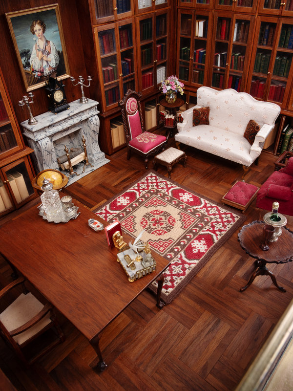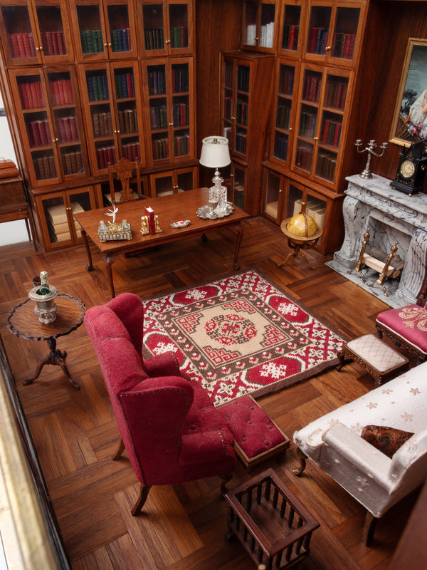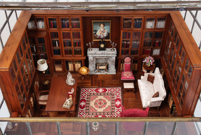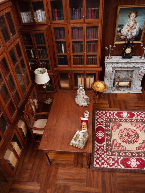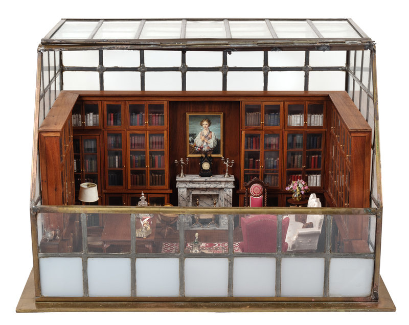 380 x 572 mm, encased in a leaded glass enclosure. With 6 miniature books, numerous miniature "book" models, and miniature furnishings including miniature silver (see below). Provenance: a descendant of John F. Fleming.