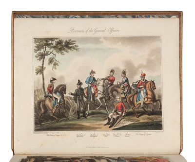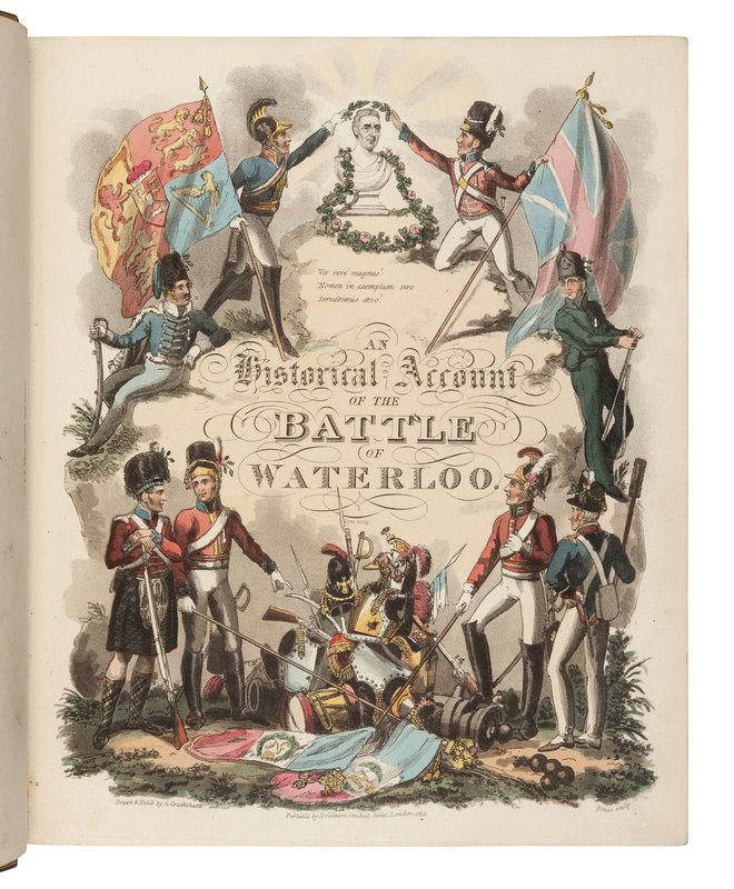 4to (322 x 272 mm). Engraved frontispiece, engraved pictorial title, folding map, folding plan, 26 aquatint plates by George Cruikshank, James Rouse, and C. C. Hamilton, a few cut smaller and mounted. (Without the "Waterloo Memorial" frontispiece, as often, with "The Portraits of the General Officers" in its stead; some light offsetting of plates.) Contemporary tan calf gilt, edges gilt (slight rubbing to extremities and covers slightly scuffed). Abbey, Life 372; Tooley 336.