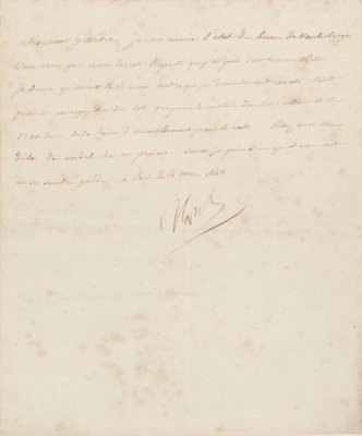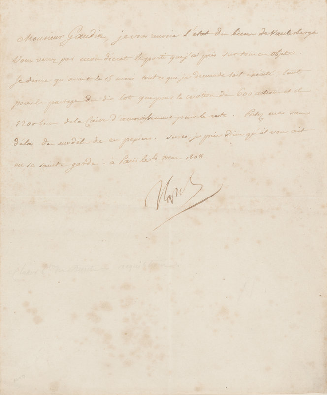 Transcription: Sir Gaudin: I am sending you the good news from Naubergh. You know according to my decree the means I took to obtain my objectives. I desire that before the March 15th that everything which I demand should be fulfilled. Everything to be divided in ten lots for the creation of six hundred actionelles, and twelve hundred livres from the Treasure of Amortissement for the rest. Send me without delay the receipts for the papers. I pray God that you are under His Holy protection. a Paris, the 3rd of March 1808. Napoleon
