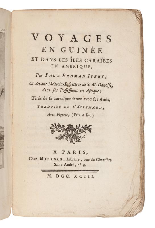 [TRAVEL & EXPLORATION]. ISERT, Paul Erdmann (1756-1789). Voyages en Guinée et dans les îles Caraïbes en Amérique. Paris: Chez Maradan, 1793.