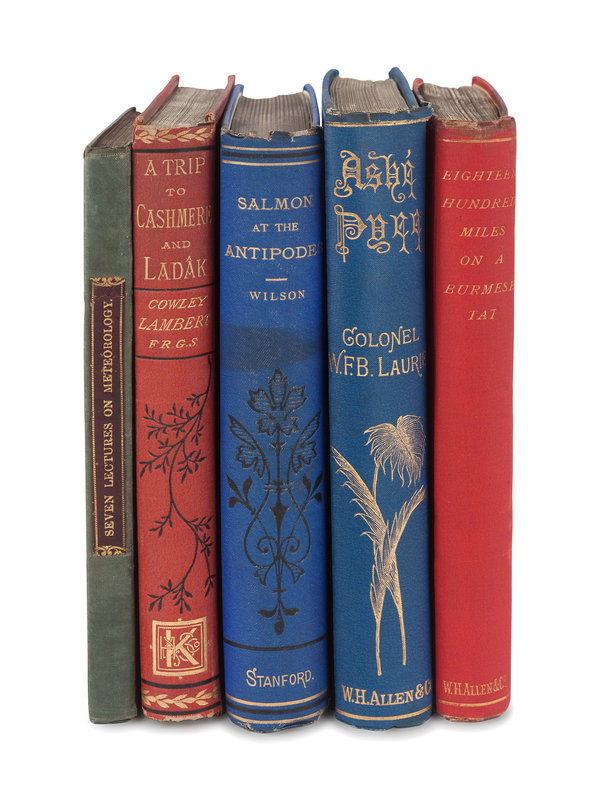 HOWARD, Luke. Seven Lectures on Meteorology. Pontefract: Printed by James Lucas, 1837. Provenance: Mercantile Library Association, New York (library stamp). FIRST EDITION. -- LAMBERT, Cowley. A Trip to Cashmere and Ladak. London: Henry S. King & Co., 1877. Provenance: Clinton Hall Association, N.Y. for the use of the Mercantile Library. FIRST EDITION. -- WILSON, Samuel. Salmon at the Antipodes. London: Edward Stanford, 1879. Provenance: Clinton Hall Association, N.Y. for the use of the Mercantile Library. Third edition. -- LAURIE, W. F. B. Ashé Pyee, The Superior Country. London: W. H. Allen & Co., 1882. Provenance: Mercantile Library of New York. (library stamp). FIRST EDITION. -- YOUNGHUSBAND, G. J. Eighteen Hundred Miles on a Burmese Tat. London: W. H. Allen & Co., 1888. Provenance: Mercantile Library of New York. (library stamp). FIRST EDITION. --Together, 5 works in 5 volumes, most FIRST EDITIONS where indicated, all in original publisher’s cloth gilt, condition generally fine.
