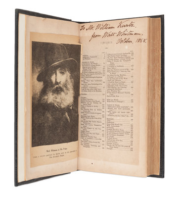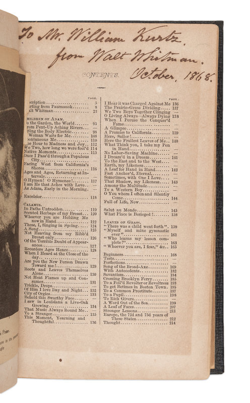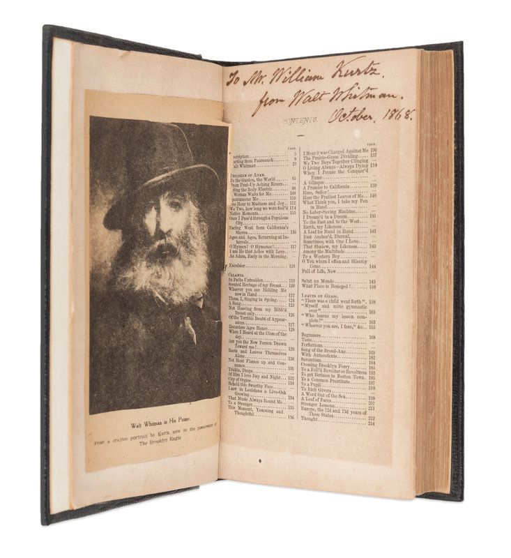 INSCRIBED BY WHITMAN TO PHOTOGRAPHER WILLIAM KURTZ: "To Mr. William Kurtz from Walt Whitman. October 1868). Kurtz, who is credited with a number of portraits of Whitman, photographed him frequently, and also photographed a group of mourners at Whitman's tomb in 1892. [Tipped in:] A newspaper clipping showing a portrait of Whitman captioned: "Walt Whitman in his Prime. From a crayon portrait by Kurtz, now in the possession of The Brooklyn Eagle." A FINE ASSOCIATION.