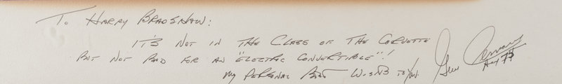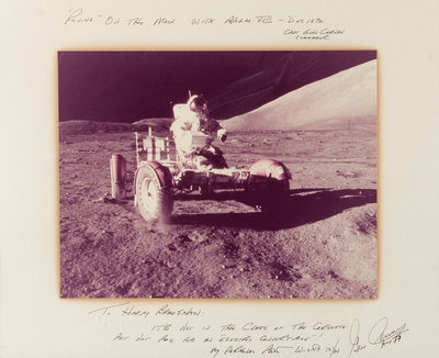 SIGNED AND INSCRIBED BY CERNAN: "'Roving' on the Moon with Apollo XVII - Dec 1972 Capt. Gene Cernan Commander. | To Harry Bradshaw: It's Not in the Class of The Corvette But Not Bad for an 'Electric Convertible'! My Personal Best Wishes to You. Gene Cernan Dec 75."