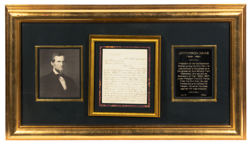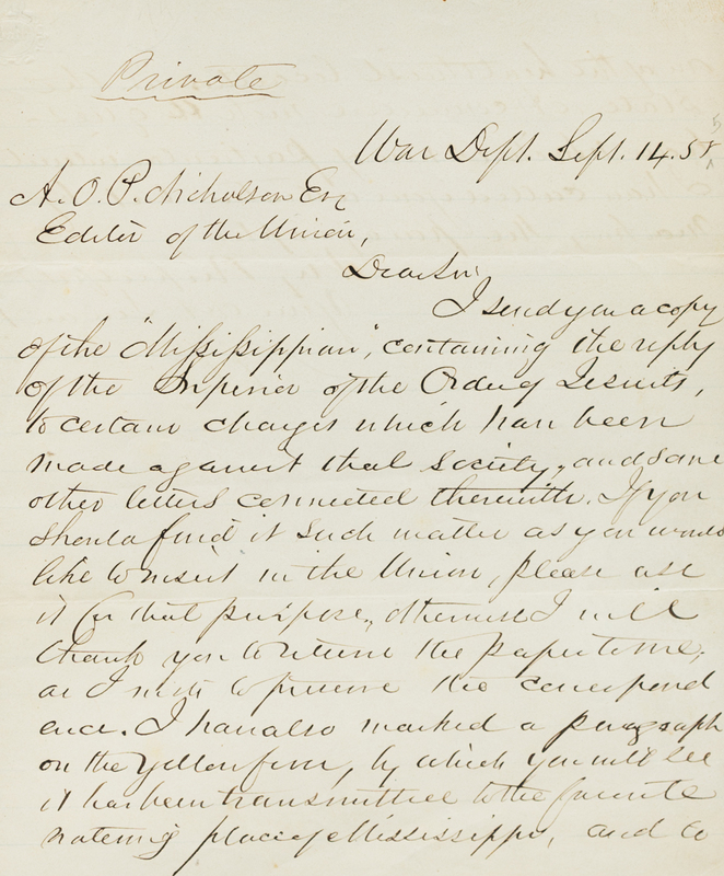 2 pages, 4to, on lightly lined paper, on recto and verso, marked "Private" at head of first page, creased to folds; matted and framed. Sending a newspaper article and letters regarding accusations against the Jesuits for a future story. "I send you a copy of the 'Mississippian,' containing the reply of the Superior of the Order of the Jesuits to certain charges which have been made against that Society, and some other letters connected therewith. If you should find it such a matter as you would like to use it in the Union, please use it for that purpose, otherwise I will thank you to return the paper to me; as I wish to preserve the correspondence. I have also marked a paragraph on the yellow form, by which you will see it has been transmitted to the favorite watering place of Mississippi, and one of the healthiest localities in the State. As connected with a question which is now of particular interest. I have called your attention to it by marking the paragraph..."