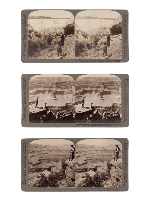 Presumed later edition, with images depicting the Santa Fe Railroad crossing Cañon Diablo, prospecting for gold, and landscape artist Thomas Moran sketching at Bright Angel Cove, and numerous scenic views. Titles on the verso of the mounts in English, French, German, Spanish, Swedish, and Russian.