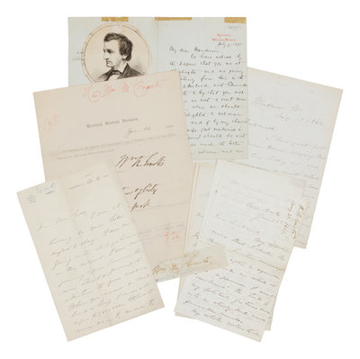 Including numerous letters to Mr. Rockwood with fine political content, and letters to: Kirk Hunt ("I have the honor to extricate myself"); General John A. Dix ("I called to day to say to you that our friend Judge Alexander S. Johnson of Utica is desirous of the place on the Appeals Commission made vacant by Judge Hunt's promotion...I suppose the vacancy will not be filled till you are in the Governor's chair"); Rutherford B. Hayes ("Dear Mr. President"); Hon. Carl Schurz; Congressman S. S. Cox (concerning his efforts to gain approval for the Cox Bill by the Senate: "[I am] working night and day"); James Blaine; Senator Manderson; and his son. (Complete list available on request.)