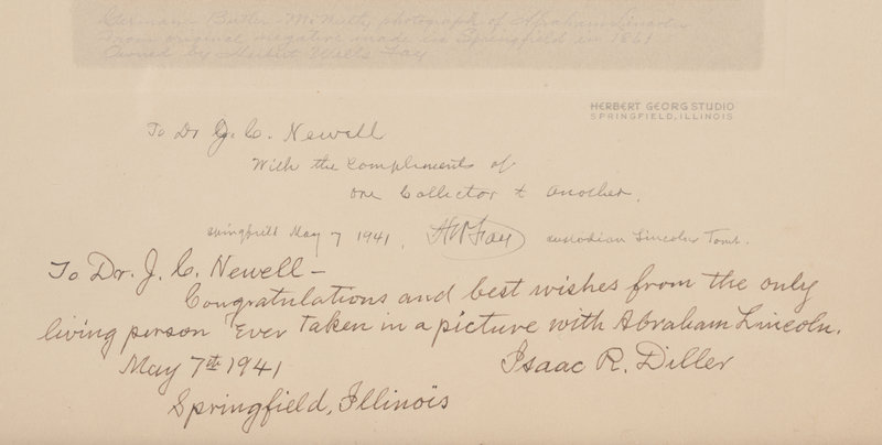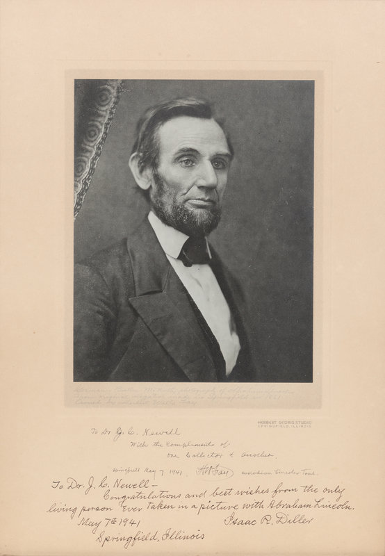 INSCRIBED BY LINCOLN COLLECTOR HERBERT WELLS FAY AND BY LINCOLN FAMILY FRIEND ISAAC R. DILLER: "To Dr. J. C. Newell With the compliments of one collector to another. Springfield May 7 1941. HW Fay Custodian Lincoln Tomb." -- "To Dr. J.C. Newell - Congratulations and best wishes from the only living person ever taken in a picture with Abraham Lincoln. May 7th 1941 Springfield, Illinois Isaac R. Diller." Fay, an avid collector of Lincolniana, owned 90 photographic portraits of Lincoln, and was custodian of the Lincoln Tomb at Oak Ridge Cemetery in Springfield. Diller, the son of Lincoln's pharmacist Roland Weaver Diller, appeared in two Lincoln family photographs taken in the Lincolns’ Springfield home in the summer of 1860 while playing with Tad and Willie. A FINE ASSOCIATION.