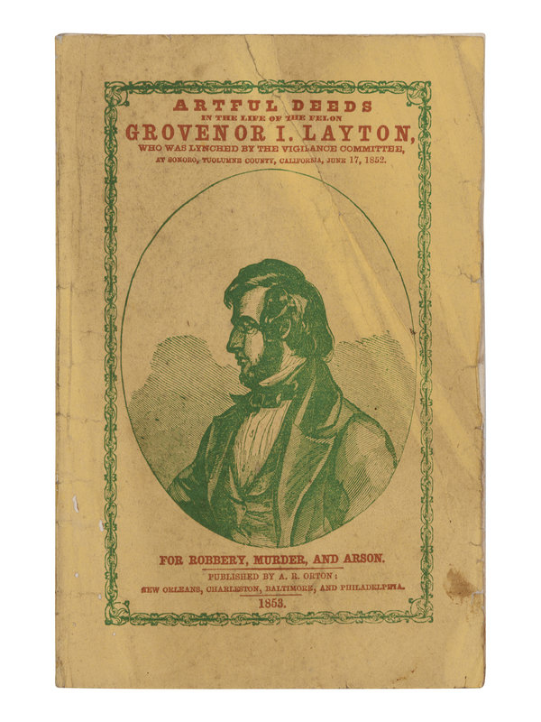[ORTON, A. R.] Two Eras in the Life of the Felon Grovenor I. Layton. Who was lynched by the Vigilance Committee, at Sonora, Tuolumne County, California, June 17th, 1852. New Orleans, Charleston, Baltimore, and Philadelphia: A. R. Orton, 1853.