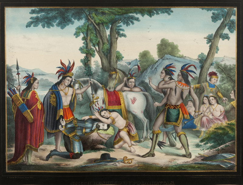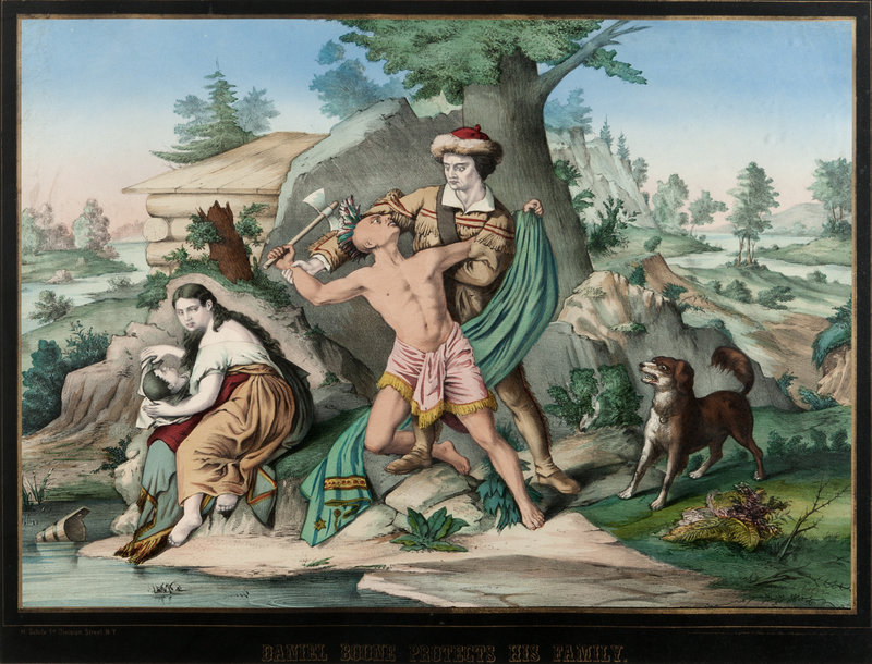 Smith Rescued by Pocahontas. -- Daniel Boone Protects his Family. New York: H. Schile, [1874]. Together, 2 lithographs with hand-coloring heightened in gum arabic, mounted on black paper with gilt borders, gilt-lettered lower margin, approx. overall sight size 19 3/4 x 25 3/4 in. (500 x 640 mm) or smaller. Matted and framed (unexamined out of frame).