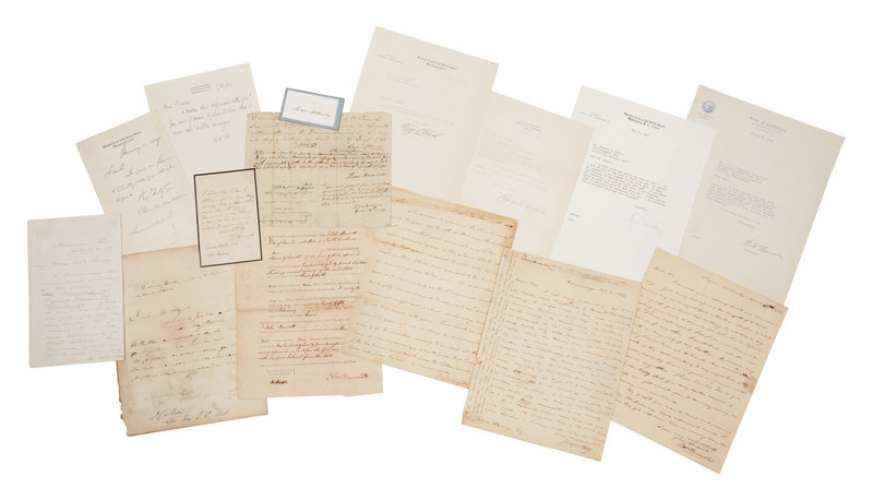 John JAY, Chief Justice. Partly printed DS, 6 October 1791, 1 page. -- John RUTLEDGE, Chief Justice. Clipped signature, 1771, 1 page. -- William CUSHING. ALS, 24 July 1800, 1 page. -- James WILSON. ADS, 2 July 1796, 1 page. And one other. -- John BLAIR. ADS, 18 May 1794, 1 page. And one other. -- James IREDELL. Partly printed DS, 25 February 1777, 1 page. -- Thomas JOHNSON. ADS, 29 March 1784, 1 page. And one other. -- William PATERSON. Signature, n.d., 1 page on 4to sheet. -- Samuel CHASE. Partly printed DS, 31 December 1763, 1 page. -- Oliver ELLSWORTH, Chief Justice. DS, 29 July 1789, with 3-line note in Ellsworth’s hand. And one other. -- Bushrod WASHINGTON. ALS, 28 January 1818, 1 page. -- Alfred MOORE. Signature on verso of a manuscript DS. -- John MARSHALL, Chief Justice. ANS, 18 June 1783. 1 page. -- William JOHNSON. ALS, 10 March 1827, 3 pages. -- Henry Brockholst LIVINGSTON. Partly printed DS, 21 May 1784, 1 page. -- Thomas TODD. ALS, TO DOLLY MADISON, 15 November 1814, 1 page. And one other. -- Gabriel DUVAL. ALS, 4 March 1807, 1 page. And one other. -- Joseph STORY. ALS, 2 October 1832, 1 page. And 2 others, including a legal book from his collection. -- Smith THOMPSON. ALS, 19 June 1822, 1 page. -- Robert TRIMBLE. ALS, 30 April 1827, 1 page. -- John McLEAN. ALS, 30 October 1854, ½ page. And 1 other. -- Henry BALDWIN. ALS, 12 October 1804, 1/2 page. -- James WAYNE. Signature, n.d., on an envelope to Hon. Ned Seward. And one other. -- Roger B. TANEY, Chief Justice. DS, 1810, 1 page. -- Philip BARBOUR. ANS, 31 December 1822, ½ page. -- John CATRON. Signature, on a manuscript letter, n.d. ADDITIONALLY SIGNED BY TANEY, WAYNE, NELSON, WOODBURY and GRIER. -- John McKINLEY. Signature on a card, n.d. -- Peter DANIEL. ANS, 29 June 1850, 1 page. And one other. -- Samuel NELSON. ALS, 21 May 1871, 1 ½ pages. And one other. -- Levi WOODBURY. ALS, 14 November 1831, 1 page. And 7 others. -- Robert C. GRIER. Manuscript DS, 11 July 1854, 3 pages. -- Benjamin R. CURTIS. ALS, 29 December 1873, 2 pages. And 2 others. -- John A. CAMPBELL. ADS, cut from a larger document, 17 July 1863, 1 page. And one other. -- Nathan CLIFFORD. ALS, 28 August 1875, 1 page. -- Noah B. SWAYNE. ALS, 25 March 1864, ½ page. -- Samuel MILLER. ALS, 30 May 1886, 3 pages, on Supreme Court stationery. And 1 other. -- David DAVIS. AD, n.d., 3 pages, on legal folio, his notes regarding the case of Tunison vs. Lewis ARGUED BY ABRAHAM LINCOLN. And one other. -- Stephen J. FIELD. LS, 29 October 1891, 3 pages. And one other. -- Salmon CHASE, Chief Justice. ALS, 30 March 1864, 1 page. -- William STRONG. ALS, 17 November 1838, 1 page. And 2 others. -- Joseph P. BRADLEY. ALS, 25 September 1870, 2 pages. And 3 others. -- Ward HUNT. Signature, ca 1876. -- Morrison WAITE, Chief Justice. ALS, 16 May 1885, 2 pages. And 1 other. -- John HARLAN. ALS, 22 July 1879, 1 page. -- W. B. WOODS. Signature, n.d. -- Stanley MATTHEWS. ALS, 21 July 1879, 2 pages. And 2 others. -- Horace GRAY. ALS, 6 June 1896, 2 ½ pages. And one other. -- Samuel BLATCHFORD. ALS, 22 December 1840, ½ page. And one other. -- Lucius Quintus Cincinnatus LAMAR. ALS, n.d., 1 page. And 2 others. -- Melville FULLER, Chief Justice. 3 signatures on cards. -- David BREWER. ALS, 16 June 1885, 1 page. And 4 others. -- Henry O. BROWN. Signature on album sheet, March 1892. ADDITIONALLY SIGNED BY DAVID BREWER AND SAMUEL BLATCHFORD. And 3 others. -- George SHIRAS. ALS, 10 February 1909, 2 pages, regarding an essay on the Monroe Doctrine. -- Howell JACKSON. Signature, n.d. And one other. -- Edward D. WHITE, Chief Justice. ALS, 23 November n.y., 1 page. And 1 other. -- Rufus W. PECKHAM. ALS, n.d., 1 page. And one other. -- Joseph McKENNA. 2 signatures on cards, n.d. One albumen photo. -- Oliver Wendell HOLMES. ALS, 11 January 1907, 1 page, on Supreme Court of the United States stationery. -- William DAY. LS, 14 March 1905, 1 page. And one other. -- William H. MOODY. TLS, 25 September 1902, 2 pages. And one other. -- Horace LURTON. Signature on a card, n.d. -- Charles E. HUGHES, Chief Justice. 7 TLSs, ca 1906-1919, ½-1 page each. -- Willis VAN DEVANTER. TLS, July 14th, ½ page. And one other. -- J. R. LAMAR. TLS Duplicate Copy, 29 March 1906, ½ page. And one other. -- Mahlon PITNEY. TLS, 29 March 1898, ½ page. -- James C. McREYNOLDS. ALS, n.d., 1 page. And 2 others. -- Louis BRANDEIS. ALS, 16 January 1941, ½ page. -- John H. CLARKE. Signature on card, July 1933. -- William H. TAFT, Chief Justice. 2 TLSs, 5 May 1927, ½ page each, both on Supreme Court of the United States stationery with envelopes. -- George SUTHERLAND. 4 signatures on cards, 3 on engraved United States Supreme Court cards. -- Pierce BUTLER. Signature, 11 March 1925, on Supreme Court of the United States stationery. -- Edward SANFORD. Signature on engraved Supreme Court of the United States card. -- Harlan F. STONE, Chief Justice. TLS, 29 January 1942, ½ page, on Supreme Court of the United States stationery. -- Owen ROBERTS. TLS, 30 June 1937, ½ page. And one signature on engraved Supreme Court of the United States card. -- Benjamin CARDOZO. ALS, 24 May 1936, ½ page, on Supreme Court of the United States stationery. -- Hugo L. BLACK. TLS, 10 June 1940, ½ page on Supreme Court of the United States stationery. -- Stanley REED. TLS, 15 December 1947, ½ page. And 3 others. -- Felix FRANKFURTER. ALS, 13 July 1949, 1 page. And 3 others. -- William O. DOUGLAS. ALS, 17 November 1950, 1 page, on Supreme Court of the United States stationery. And 2 others. -- Frank MURPHY. TLS, 25 April 1938, ½ page, promising to send a signed photo, on State of Michigan stationery. -- James F. BYRNES. TLS, 8 December 1936, 1 page. And one other. -- Robert JACKSON. TLS, 14 February 1940, 1 page. -- Wiley RUTLEDGE. TLS, 13 April 1942, ½ page, on United States Court of Appeals stationery. -- Harold BURTON. TLS, 2 September 1942, 1 page. And 3 others. -- Fred M. VINSON, Chief Justice. TLS, 6 July 1943, ½ page. -- Tom C. CLARK. TLS