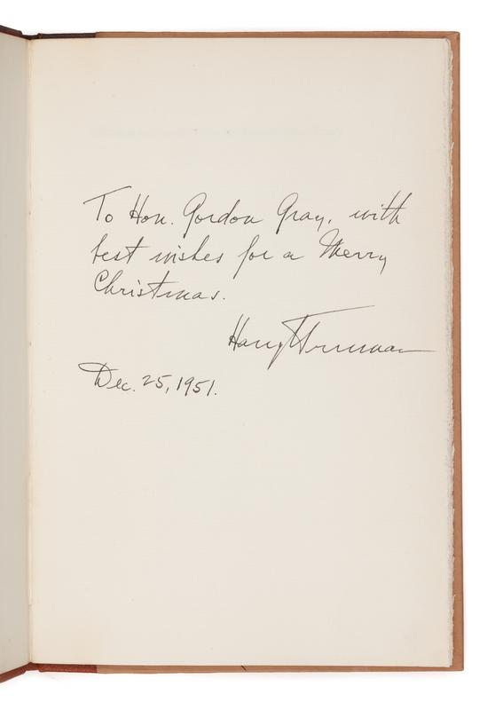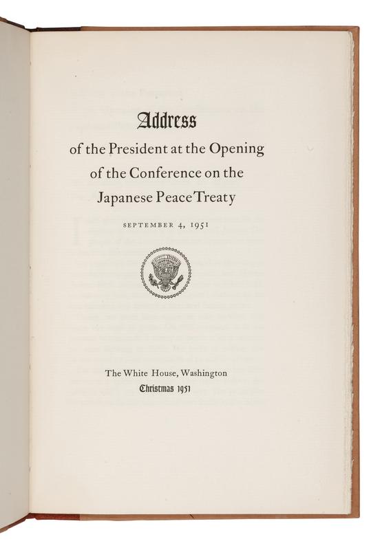 LIMITED EDITION, number 51 of 60 copies. PRESENTATION COPY, INSCRIBED BY TRUMAN: “To Hon. Gordon Gray, with Best Wishes for a Merry Christmas. Harry S. Truman, Dec. 25, 1951.” Gordon Gray served as Secretary of the Army in the Truman administration from 1949 to 1950. The Truman White House issued this book at Christmas 1951 to commemorate Truman's speech proposing to end the American-led Allied occupation of Japan and re-establish peaceful relations between Japan and the United States.