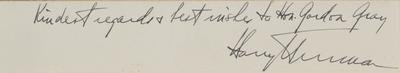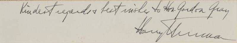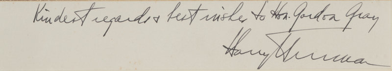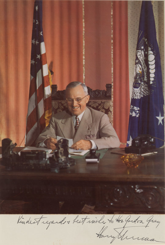 TRUMAN, Harry (1884-1972). Photograph, inscribed lower margin: "Kindest regards & best wishes to Hon. Gordon Gray. Harry Truman."