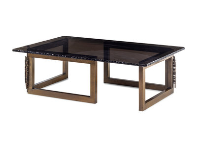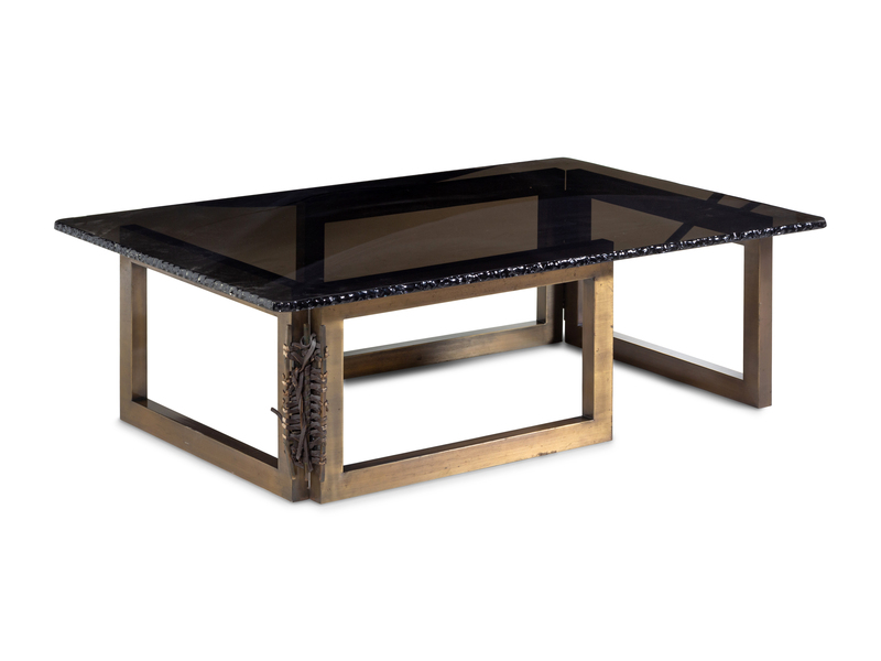 bronze, leather, smoked glass with hand-chiseled edge