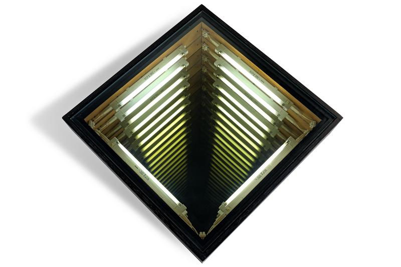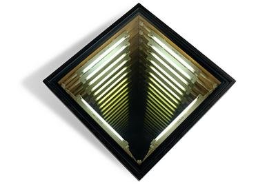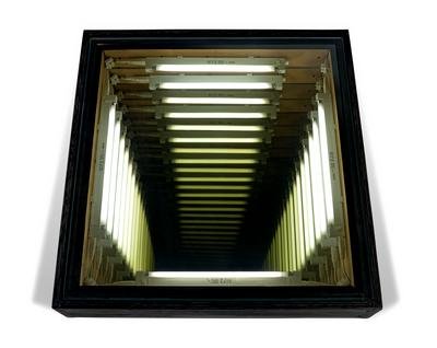 , 2005fluorescent light, glass, mirror, one-way mirror, wooden box and electric energy