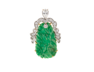 Containing one carved jade plaque measuring approximately 27.00 x 15.15 mm, one pear shape diamond weighing approximately 0.40 carat, six tapered baguette cut diamonds weighing approximately 0.30 carat total and 16 round brilliant cut diamonds weighing approximately 0.15 carat total. Mounted in yellow gold and platinum.