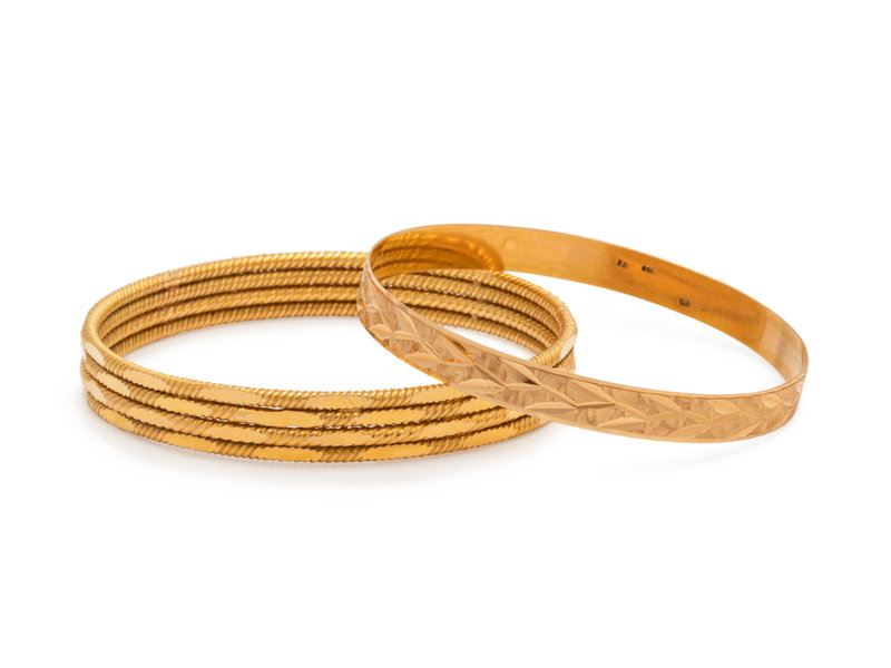 Consisting of one bangle consisting of four attached twisted bangles, together with a bangle with engraved detail.