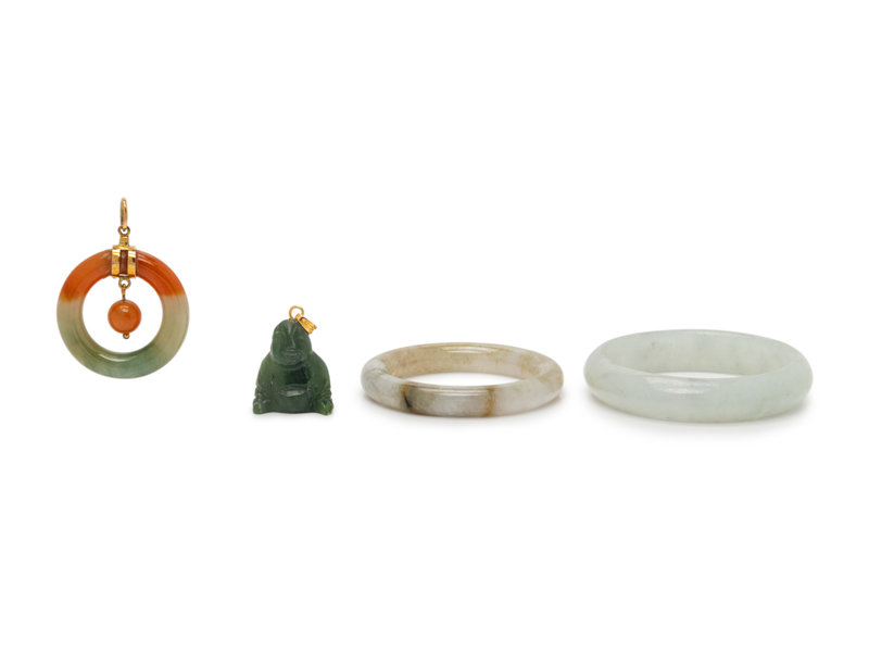 Consisting of two children's bangle bracelets, a carved Buddha pendant, together with a jade pendant with yellow gold mounts.