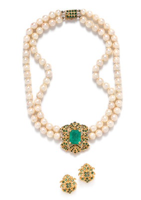 Consisting of a double strand necklace containing numerous pearls measuring approximately 8.05-8.30 mm, in diameter, with a central gold plaque containing one emerald cut emerald measuring approximately 15.90 x 12.65 x 10.30 mm and numerous round mixed cut emeralds with a box clasp containing 11 round mixed cut emeralds, together with a pair of earclips containing numerous round mixed cut emeralds. Mounted in high karat gold.