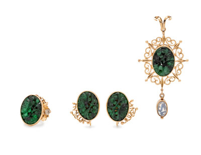 Consisting of a pendant containing one oval pierced and carved jade plaque and one oval shape cabochon cut moonstone, a ring containing one pierced and carved jade plaque and one old European cut diamond, together with a pair of earclips containing two oval pierced and carved jade plaques. Mounted in yellow gold.
