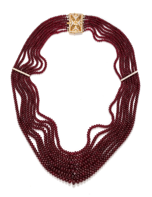 Consisting of seven strands of graduated ruby beads with two yellow gold bar spacers, the bicolor gold clasp and spacers containing 52 round brilliant cut diamonds weighing approximately 0.35 carat total.