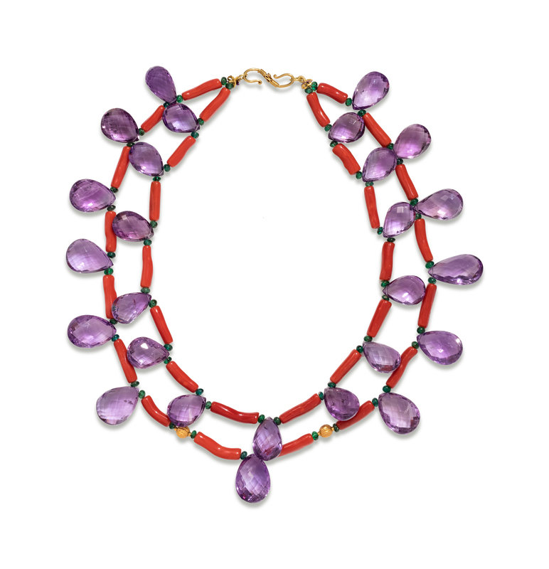 Consisting of two strands containing 26 amethyst briolette beads, 30 coral beads, 60 emerald beads and two yellow gold beads, with a yellow gold hook clasp.