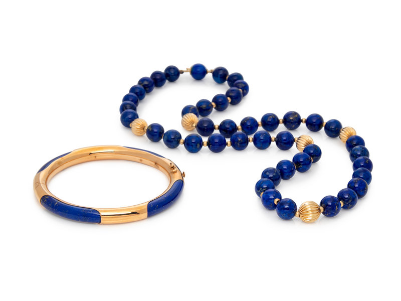 Consisting of a yellow gold and lapis lazuli bead necklace, together with a yellow gold and lapis lazuli bangle bracelet, hinged with side clasp.