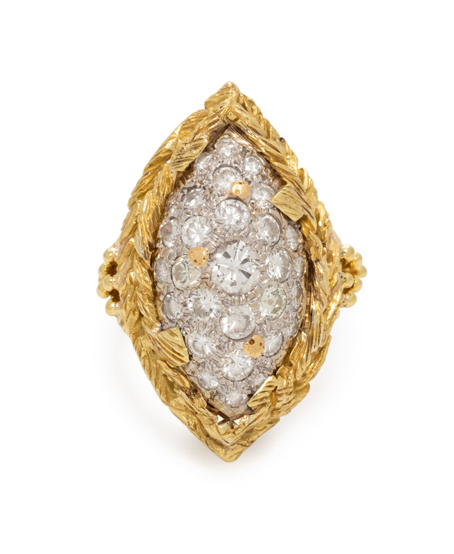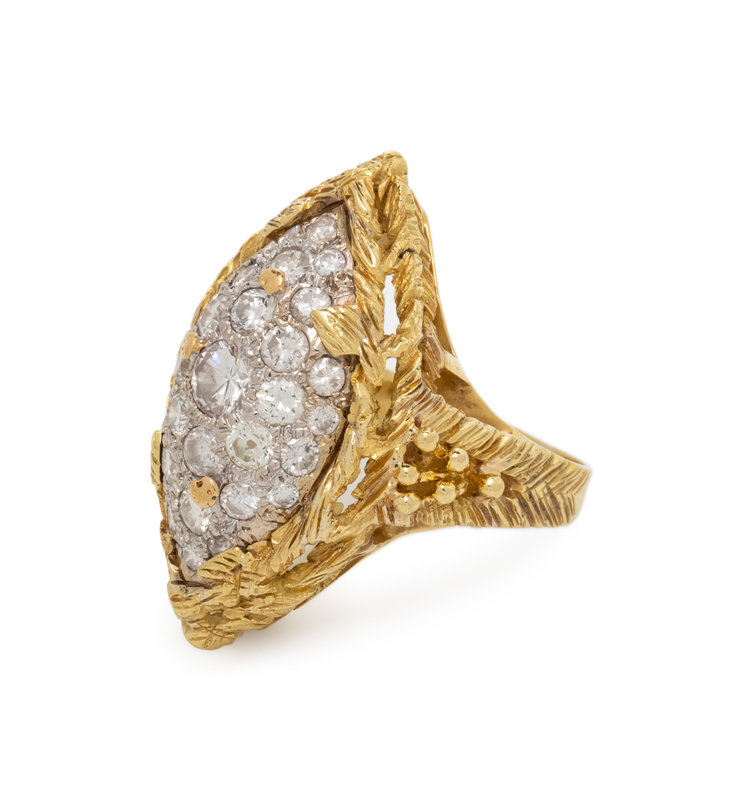 Containing 29 round brilliant cut diamonds weighing approximately 1.20 carats total interspersed with three decorative gold nuggets.