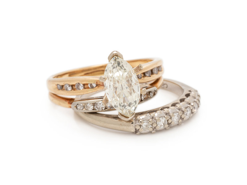 Consisting of a fused ring containing one marquise shape diamond weighing 0.91 carat and 16 single cut diamonds weighing approximately 0.15 carat total, together with a ring containing six single cut diamonds weighing approximately 0.07 carat total.