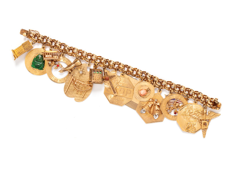 Consisting of a double rolo chain bracelet suspending a rotating Beefeater charm, a disc charm surmounted with a carved hardstone Buddha, a San Francisco streetcar charm, a Happy Anniversary disc charm with rose containing one seed pearl and one red glass, a tooth charm, an I LOVE YOU clothesline charm containing one diamond, a rotating slot machine charm, a cross charm, a Bermuda charm with a bike, an I'LL NEVER STOP LOVING YOU charm, a May calendar charm with emerald on May 27, an ALOHA HAWAII charm with carved shell flower, a hexagonal wedding bells charm containing three diamonds, an enamel American flag charm, an I MARRIED AN ANGEL charm with one red glass, a hexagonal Happy Anniversary 25 charm and a Staff of Hermes charm with D.