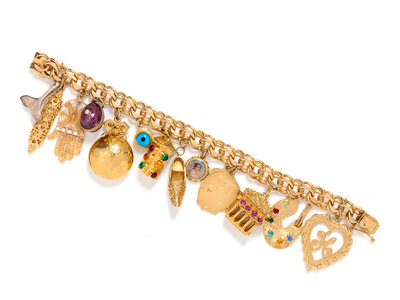 Consisting of a fancy link bracelet suspending a sterling silver whale tail charm, a mezuzah charm, a 14 karat gold hamsa charm, a gold plated purple enamel egg charm with two single cut diamonds, a charm with matador engraving, a glass evil eye charm, a traffic light charm containing green, yellow and red glass cabochons, a filigree shoe charm, a painted portrait charm, a girl profile charm engraved Connie with a seed pearl eye, a boy profile charm engraved Stevie, a temple charm containing 12 round mixed pink sapphires, an artist's palette charm containing six gemstones and a heart charm with cutout script H.