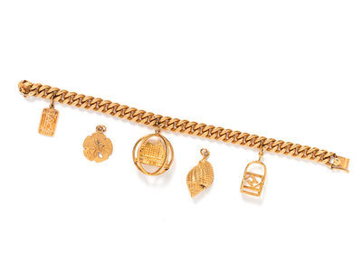 Consisting of a curb link bracelet suspending a ski lift chair charm, a Broadmoor Hotel charm and a Rolls Royce charm, together with a sand dollar charm and a shell charm.