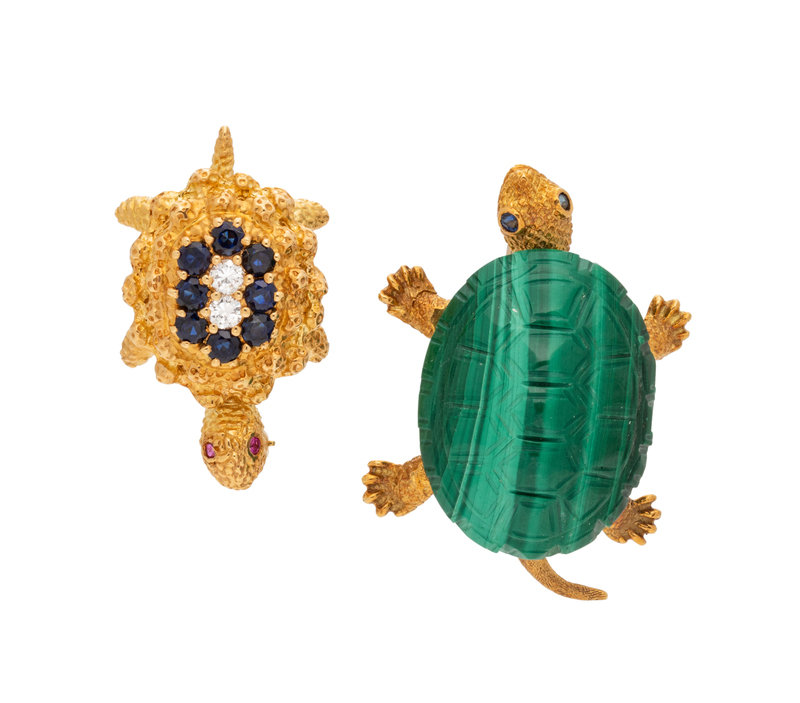 Consisting of a brooch with carved malachite shell and sapphire eyes, together with a brooch containing eight round mixed cut sapphires measuring approximately 2.30 mm in diameter, two round brilliant cut diamonds weighing approximately 0.15 carat total and two ruby eyes.