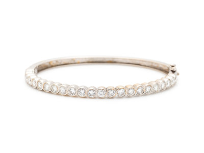 Containing 23 round brilliant cut diamonds weighing approximately 2.50 carats total, hinged with side clasp. Mounted in white gold.
