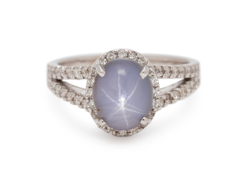 Containing one oval shape cabochon cut star sapphire measuring approximately 9.35 x 7.50 x 6.25 mm and 52 round brilliant cut diamonds weighing approximately 0.55 carat total. Mounted in white gold.