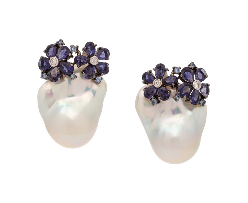 BAROQUE CULTURED PEARL, IOLITE, SAPPHIRE AND DIAMOND EARCLIPS