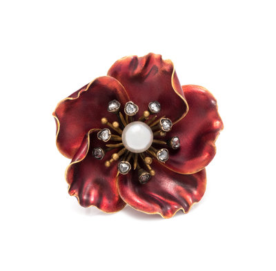 Containing one pearl (origin not tested) measuring approximately 5.30 mm in diameter and 10 rose cut diamonds, with translucent red enamel petals.