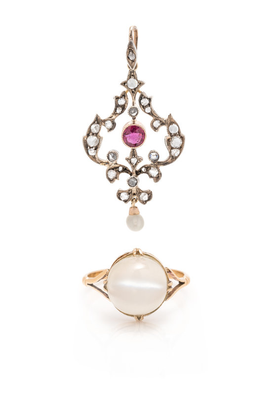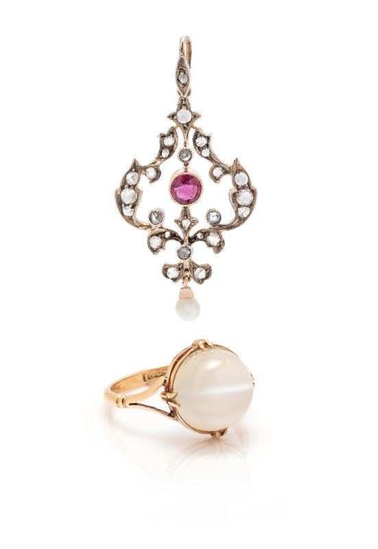 Consisting of a ring containing one round cabochon cut moonstone measuring approximately 11.10 mm in diameter, together with a silver topped gold pendant containing one round mixed cut ruby measuring approximately 4.50 mm in diameter, numerous rose and mixed cut diamonds and one pearl drop (origin not tested).