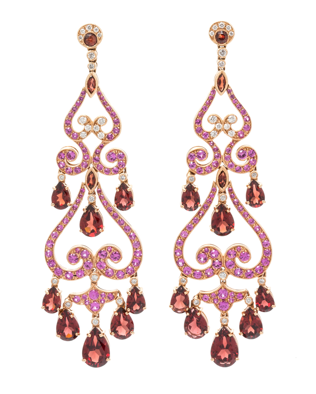 Containing 16 pear shape mixed cut garnets, four marquise cut garnets, two round mixed cut garnets, 172 round mixed cut pink sapphires measuring approximately 1.00-2.25 mm in diameter and 44 round brilliant cut diamonds weighing approximately 0.50 carat total. Mounted in rose gold.