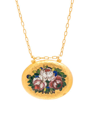 Consisting of an oval shape hammered gold pendant with central floral motif micromosaic.