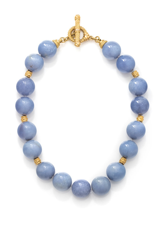 Consisting of 17 round blue chalcedony beads measuring approximately 18.00 mm in diameter, interspersed with six textured yellow gold beads and toggle clasp.