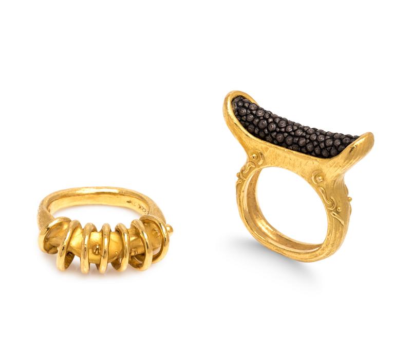 Consisting of a sculptural matte gold ring with high polish gold wire surround, together with a ring containing a central rounded leather section.