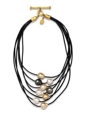 Consisting of nine leather cords suspending nine Baroque pearl beads of various color, with high karat gold endcaps and toggle clasp.