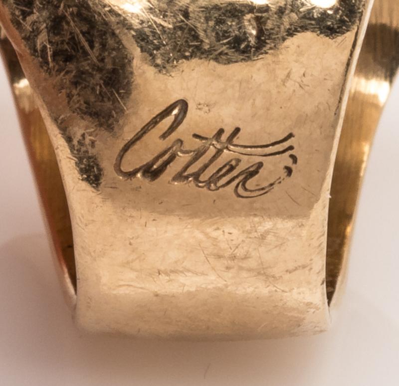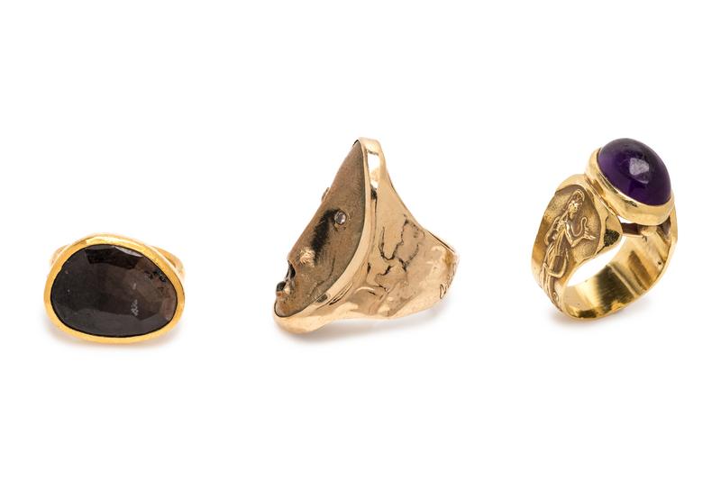 Consisting of a high karat gold ring by Gurhan containing one freeform labradorite measuring approximately 13.75 x 18.30 mm, a ring by Jim Cotter containing a bronze mask with round brilliant cut diamond eyes, together with a ring depicting goddess figures at the shoulders and containing one oval shape cabochon cut amethyst measuring approximately 13.65 x 9.95 x 7.05 mm.