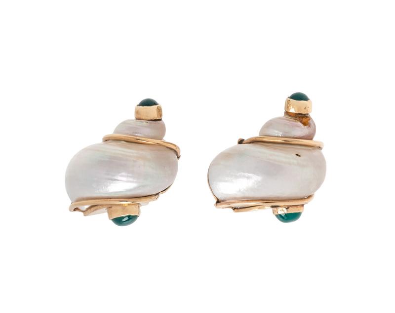 Containing two shells accented with four round cabochon cut dyed green chalcedony. Mounted in yellow gold.