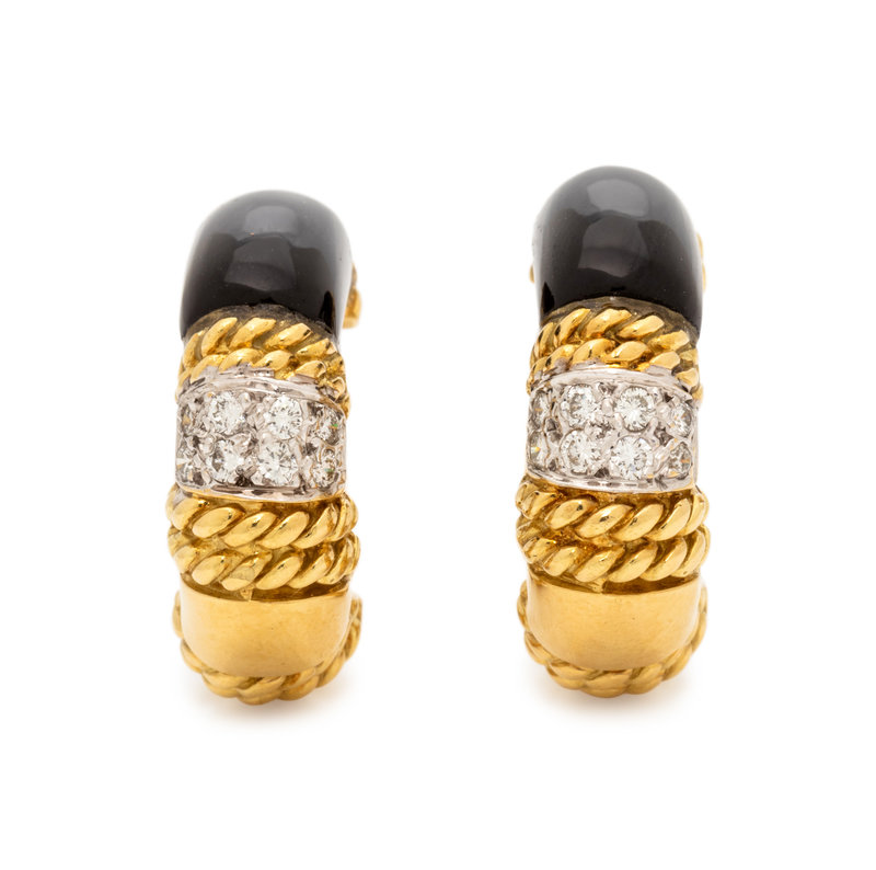 CASSIS, YELLOW GOLD, ONYX AND DIAMOND EARCLIPS