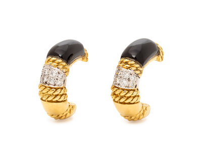 Consisting of half hoop earclips containing two onyx plaques and 16 round brilliant cut diamonds weighing approximately 0.10 carat total, posts with clip backs. Mounted in bicolor gold.