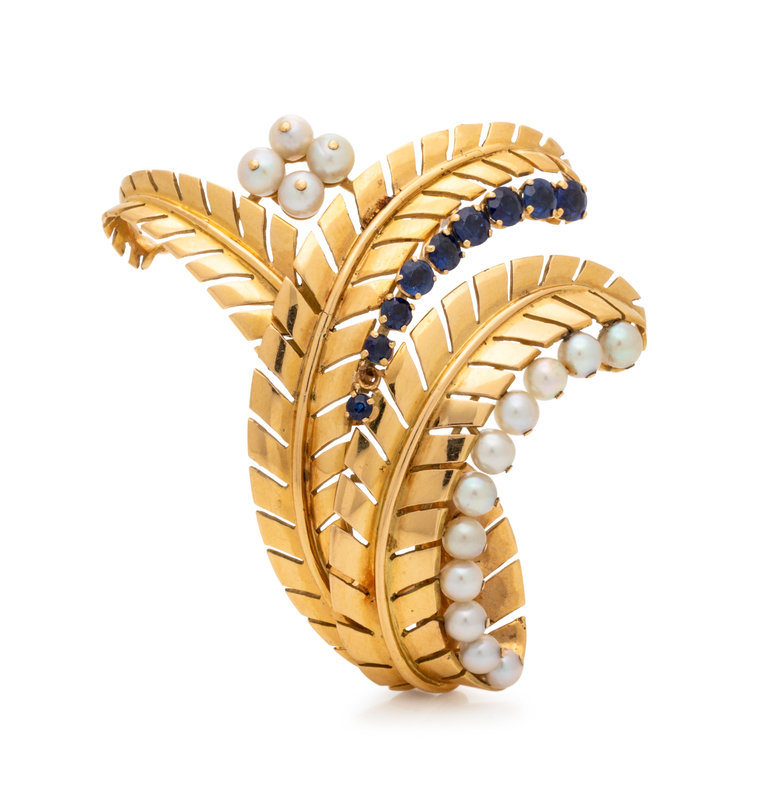 FRENCH, YELLOW GOLD, CULTURED PEARL AND SAPPHIRE BROOCH