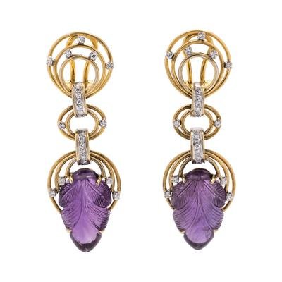 Consisting of two carved leaf amethyst drops measuring approximately 22.00 x 14.00 mm, suspended from open links containing 44 round brilliant cut diamonds weighing approximately 0.60 carat total. Mounted in yellow gold.