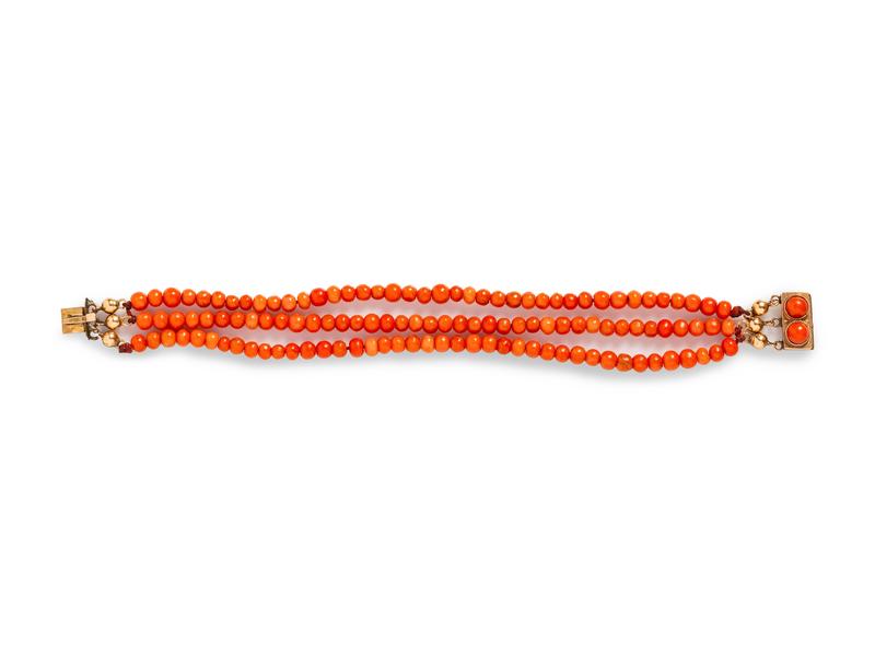 Consisting of three strands of coral beads measuring approximately 3.95-4.25 mm in diameter, the yellow gold box clasp containing two round cabochon cut coral.
