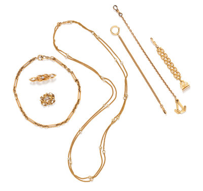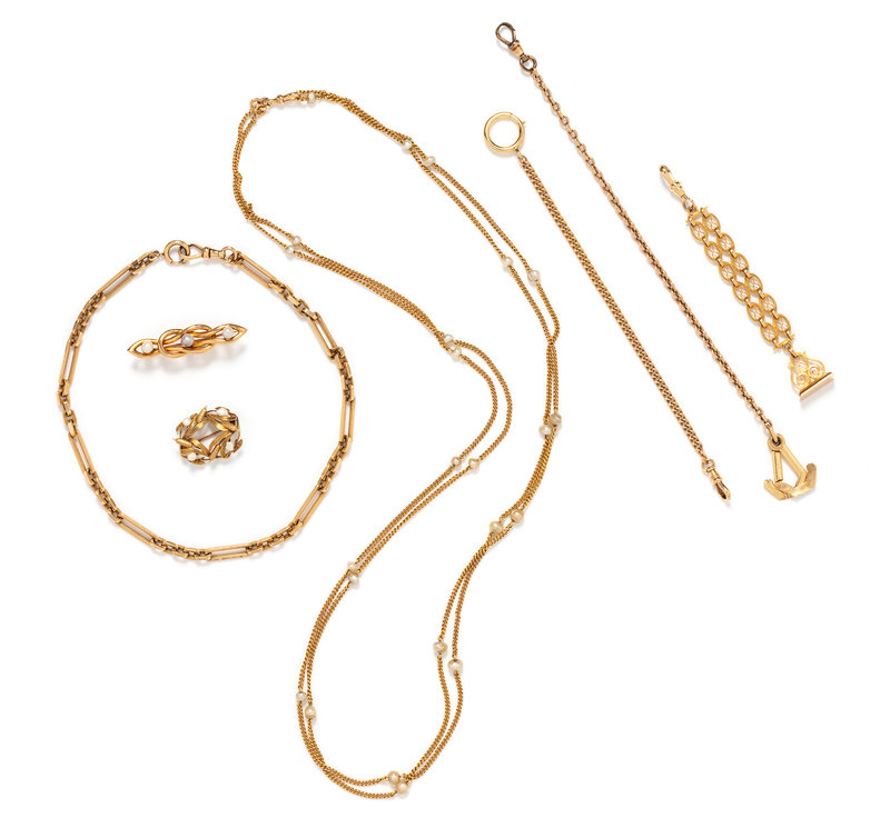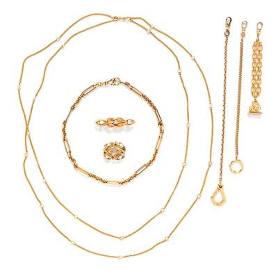 Consisting of a vest fob chain of oval fancy link design with an Albert swivel clasp and suspending a matching blank wax seal, a curb link fob chain measuring approximately 3.00 mm wide with an oversize spring ring and an Albert swivel clasp, a cable link fob chain with oversize clasp and gold-filled Albert swivel clasp, a fancy link fob chain spring ring clasp and Albert swivel clasp, a cable link longchain interspersed with cultured pearls, a cattail brooch with four pearls, together with a brooch containing three pearls.